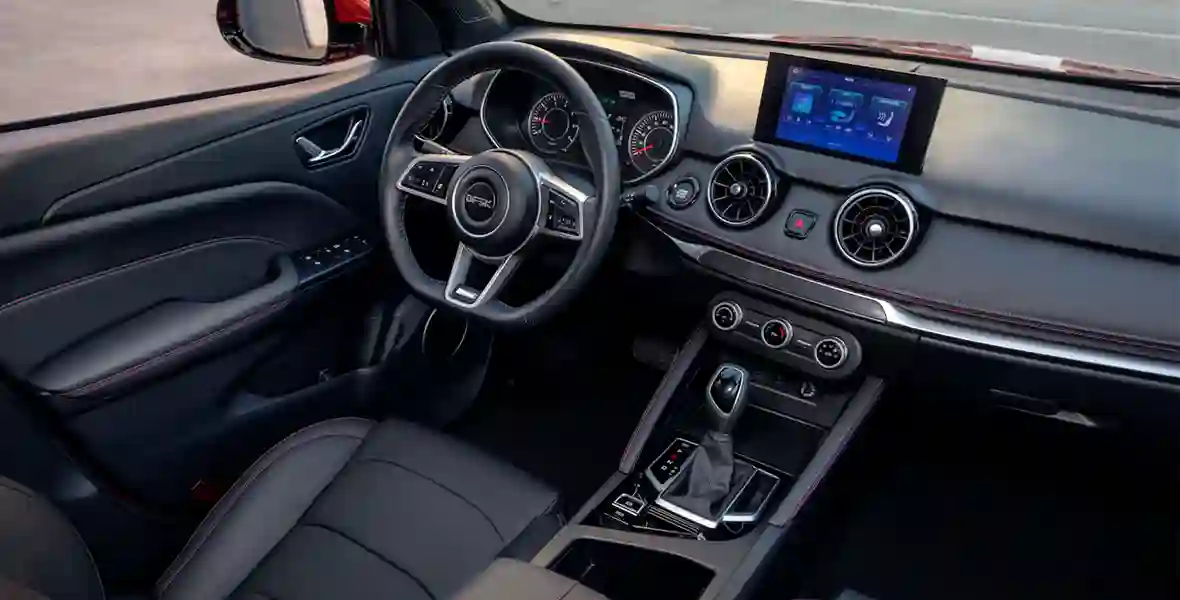 Салон вроде бы простенький. Но с некоторыми претензиями. В его оформлении, оснащении чувствуется желание разработчиков предоставить владельцу все необходимое, отказавшись от того, без чего можно обойтись. Так, жесткий пластик мирно соседствует с мягкими накладками, и опять же есть яркие акценты в отделке. Черно-красная обивка сидений, черный потолок и красная отстрочка придают салону этакий спортивно-молодежный характер. И руль здесь модный, со срезанным нижним сегментом. Он обтянут приятной на ощупь перфорированной экокожей, но регулируется только по углу наклона. Привычной для «китайца» панорамной крыши (и даже люка) нет. Да и надо ли?