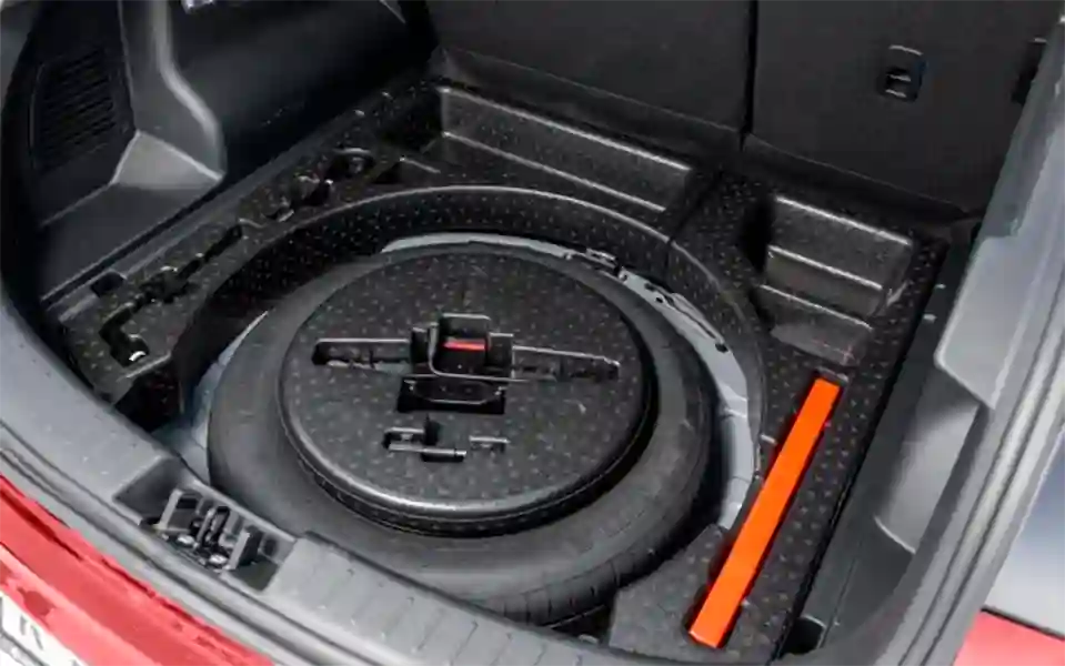 Средний ряд поделен на сдвижные части. Если найти компромисс трансформации, на галерке упаковываешься беспроблемно. Багаж, разумеется, не сдаем — ибо некуда, за третьим рядом остается минимум площади. Полноценную запаску выдворили под кузов.